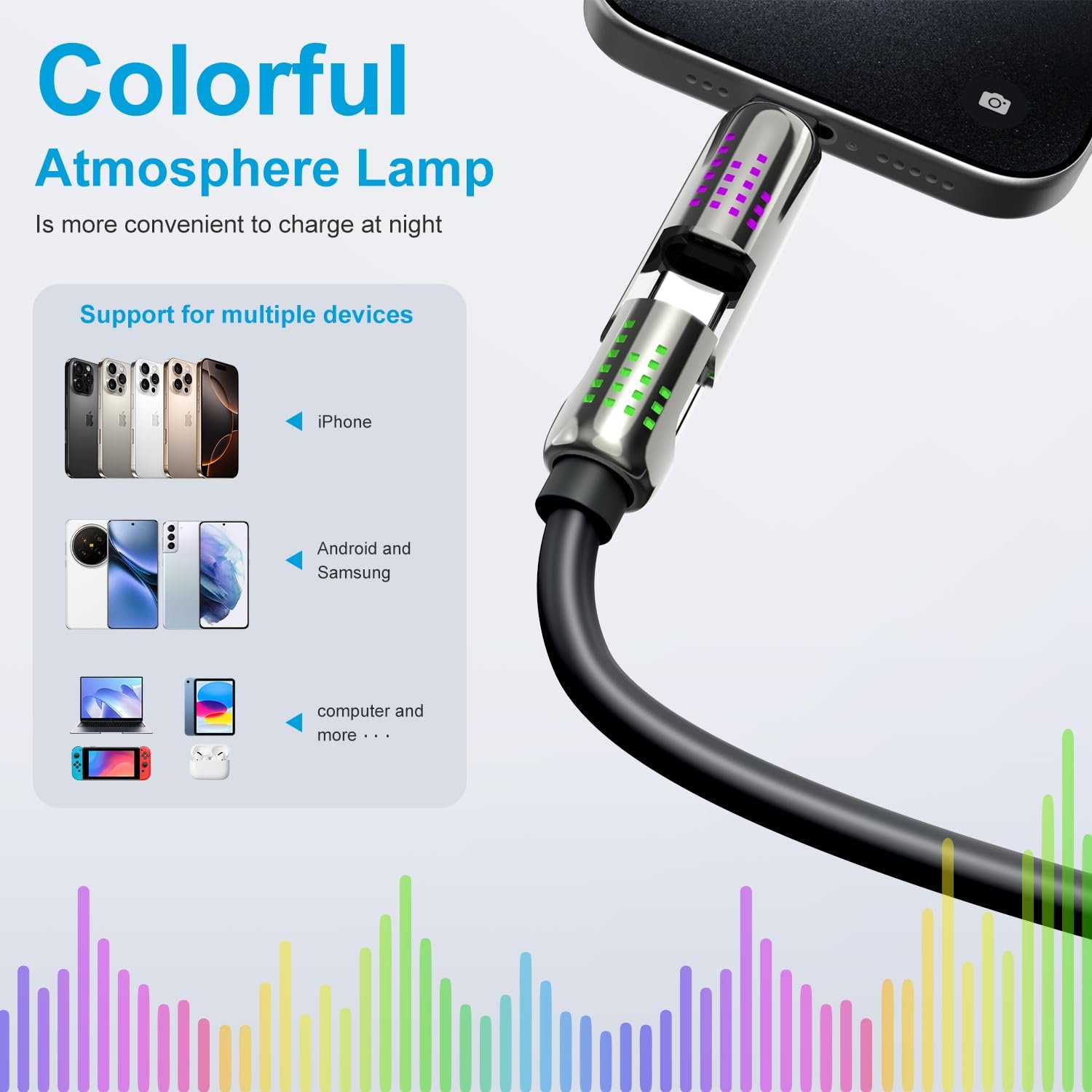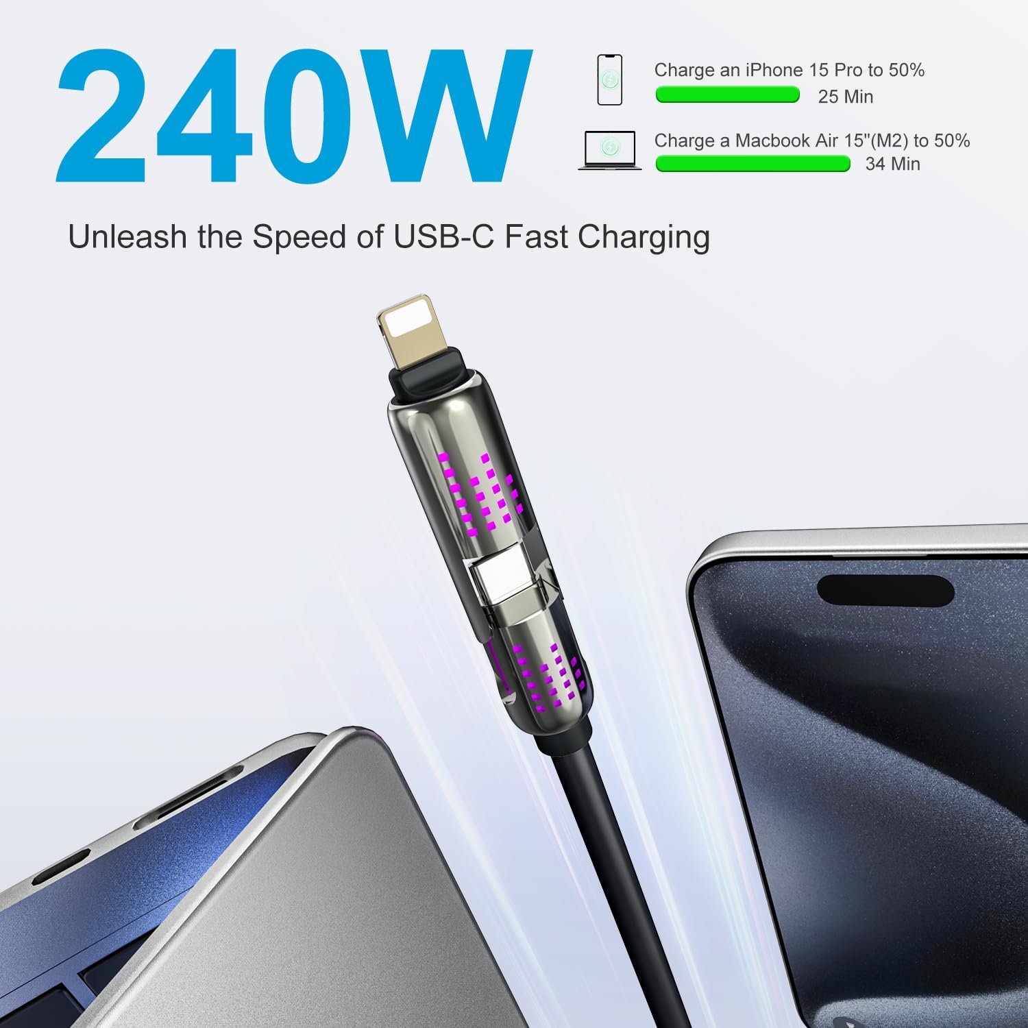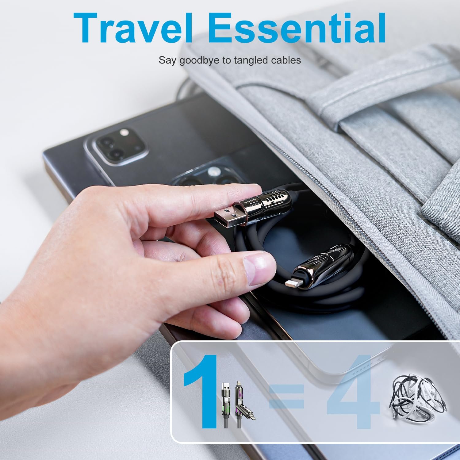 • Note: 【USB C Cable cannot be used with thick phone cases】 【4 in 1 charging cable for all devices】 This 4-in-1 USB-C fast charging data cable supports fast charging and data transfer, and is compatible with iPhone, iPad, Samsung Galaxy, MacBook and other devices. 4in1 charging cable has four connectors: USB-C to C, USB-C to L, USB-A to C, and USB-A to L, simplifying your charging and synchronization experience. The thickened gold-plated copper core improves stability and speed, supports 240W fast charging, and no longer worries about carrying multiple cables when traveling or on business trips.